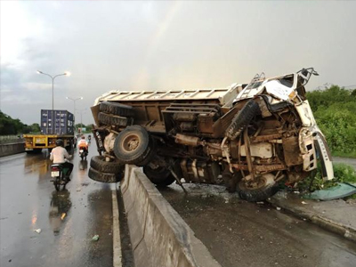 Hàng chục người đi đường thoát chết khi chiếc xe ben lật ngang dưới dốc cầu Phú Mỹ, quận 2, TP.HCM vào chiều 7.8.