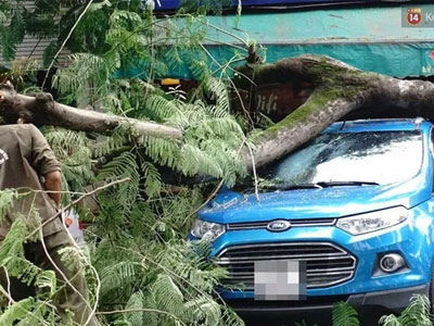 Khoảng 16h30 ngày 3/8, một chiếc ô tô đang đỗ sát vỉa hè khu vực số 10 Lý Thường Kiệt, Hà Nội thì bất ngờ bị một cây xanh bật gốc đổ sập xuống, đè vào đầu xe.