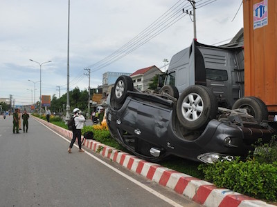 Ôtô 7 chỗ đang chạy trên đường ở TP Quảng Ngãi, bất ngờ va chạm với xe đầu kéo, lật ngửa trên dải phân cách. 6 người ngồi trên xe bị thương phải đi cấp cứu.