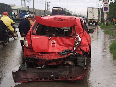 Chờ đèn đỏ trên Quốc lộ 22 (TP HCM), ôtô 4 chỗ đang ra sân bay bị xe tải húc văng 10 m.