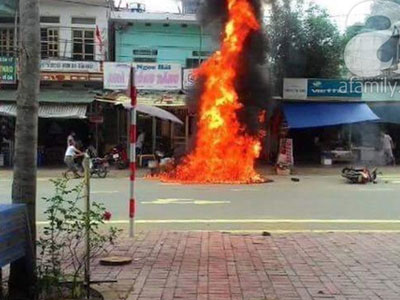 Dựng chiếc xe máy có can xăng ở gần bếp than của cửa hàng bán cháo nên chiếc xe đã bị bén lửa bốc cháy dữ dội.
