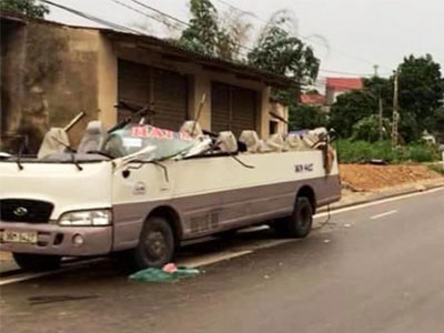Xe ben “cứa” đứt nóc xe khách, 7 người nhập viện