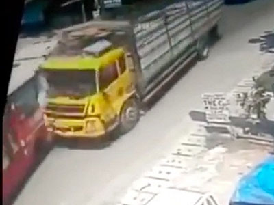 Hàng chục hành khách trên xe buýt thoát chết khi bị chiếc xe tải nổ lốp đâm trúng sườn. 6 người bị thương, trong đó có một người đi xe máy.