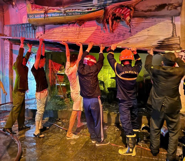 Tại hiện trường, lực lượng cảnh sát PCCC - CNCH khẩn trương triển khai lực lượng, phá cửa cuốn để vào bên trong nhà đưa người mắc kẹt ra ngoài an toàn, đồng thời phun nước dập tắt đám cháy, ngăn chặn không cho ngọn lửa lan sang các hộ dân liền kề.