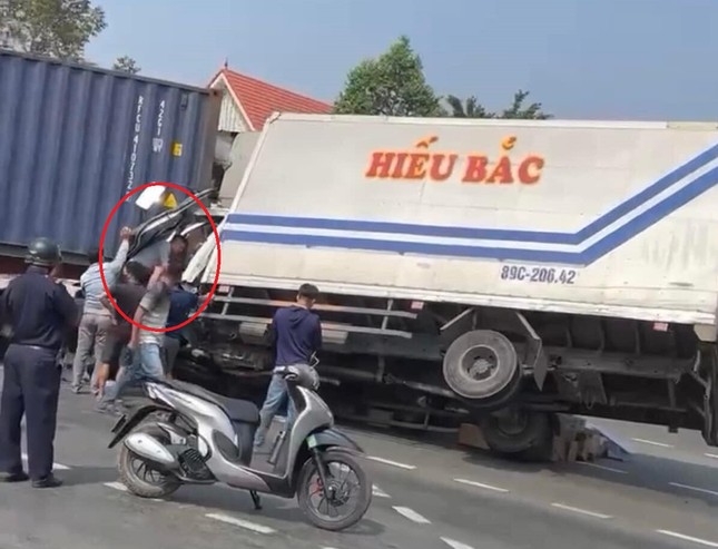 Cú tông mạnh bên hông xe container khiến đầu xe tải biến dạng. Phát hiện vụ việc, rất đông người đi đường đã dừng lại, chạy tới phá cửa xe tải để giải cứu nam tài xế ra khỏi cabin.
