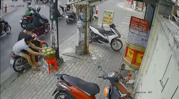 Theo dõi hình ảnh trong đoạn clip cho thấy, 3 nam thanh niên không đội mũ bảo hiểm chở nhau bằng xe máy đang dừng đèn đỏ bên đường. Lợi dụng lúc vắng vẻ, người bán hàng không ở đó, nam thanh niên ngồi phía sau xe máy đã ngoài người "cuỗm" luôn cả rổ xoài đặt trên chiếc ghế nhựa trên vỉa hè rồi phóng xe đi mất.