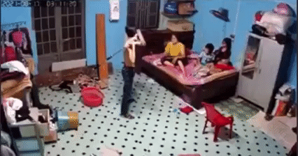Về phần người phụ nữ sau khi trốn tránh được những cú đánh đã phải khóc lóc đồng ý đưa điện thoại để nam thanh niên dừng tay. Hai đứa trẻ giường rất sợ hãi, nép vào một góc khi chứng kiến cảnh tượng như vậy.