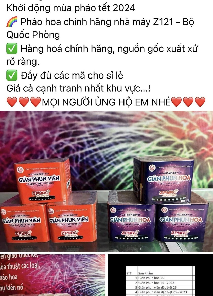 Chỉ cần tìm kiếm trên Facebook với từ khoá "mua pháo hoa", “pháo hoa bộ quốc phòng", “giàn phun viên"... sẽ cho ra nhiều tài khoản cá nhân và hội nhóm mua bán khác nhau trên mạng xã hội, thu hút hàng nghìn người theo dõi với hàng trăm lượt bình luận, chia sẻ, giao dịch, mua bán.
