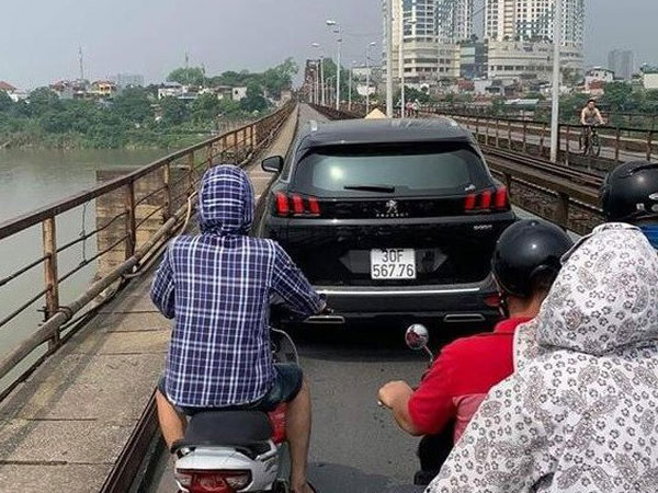 Hành động thiếu ý thức của tài xế trên khiến nhiều người tham gia giao thông vô cùng bức xúc.Được biết, chiều rộng của làn đường lưu thông trên cầu Long Biên là 2m, trong khi đó, bề rộng của chiếc xe 5 chỗ Peugeot là 1,8m, không đủ để xe sau có thể vượt lên.