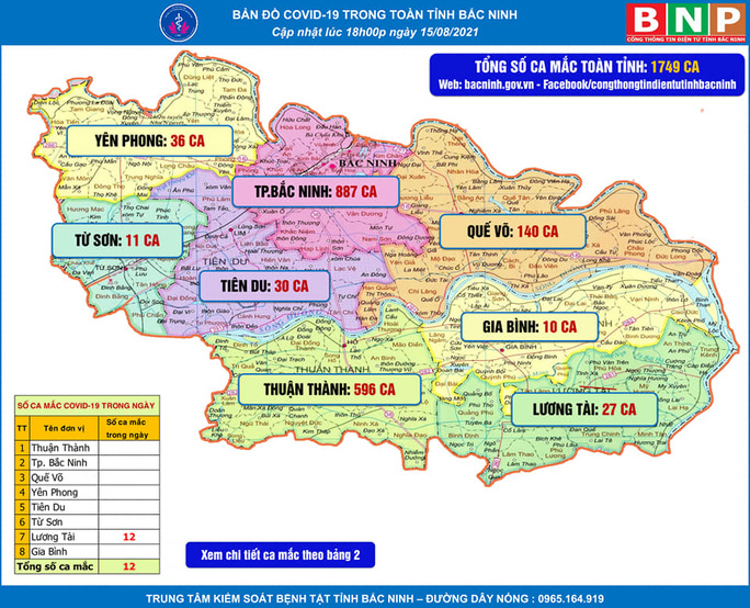 Trước đó, sau 21 ngày liên tiếp không phát sinh ca mắc Covid-19 mới trong cộng đồng, ngày 14-8, tỉnh Bắc Ninh ghi nhận 9 ca mắc Covid-19 mới tại huyện Lương Tài, đều là nhân viên Công ty Viettel Post Lương Tài.