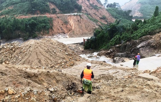 Trong sáng 23/10, công nhân cầu đường và công binh đã tiến hành lấp đá, đất cát đóng bao, trải bạt lót nền, xếp rọ đá, đổ nền mặt đường... để từng bước gia cố, thông tuyến các điểm bị vùi lấp hoặc sạt lở nghiêm trọng trên đường 71 trước đó.