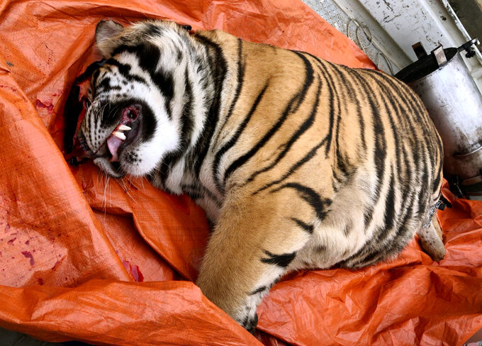 Tại hiện trường, cá thể này bị trói hai chân sau bằng dây xích, miệng chảy máu, nằm bất động trên tấm bạt cỡ lớn phía sau khu vệ sinh. Bên cạnh là nồi hơi được cho dùng nấu cao động vật. Con hổ nặng hơn 250 kg, là động vật rừng nguy cấp, quý hiếm thuộc nhóm IB, nghiêm cấm khai thác vì mục đích thương mại.