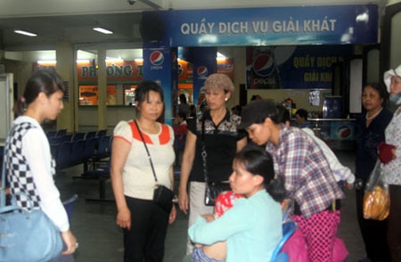Đinh Thị Lệ (áo xanh) đã dựng lên một màn kịch hoàn hảo để lừa những người tốt ở bến xe |