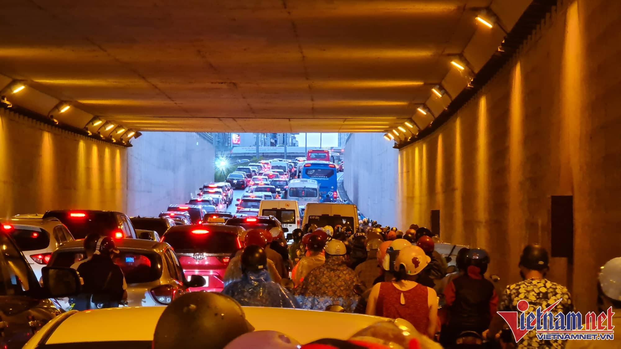 Ngoài ra, tại Đại lộ Thăng Long đoạn giao nhau với đường Phạm Hùng hàng nghìn phương tiện, trong đó có nhiều xe container xếp hàng dài.