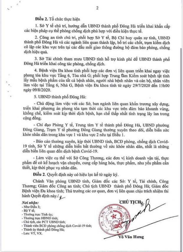 Bên cạnh đó khoanh vùng, phong tỏa cách ly tạm thời tại các khu vực gồm: Xung quanh Cty Bảo Châu (221 Lê Duẩn, phường Đông Giang), khu phố 2 (phường Đông Giang), thành lập 3 chốt kiểm soát ở 2 khu vực này; tầng 6, tòa nhà G, Bệnh viện Đa khoa tỉnh Quảng Trị. Thời gian thực hiện từ 15h ngày 9/8.