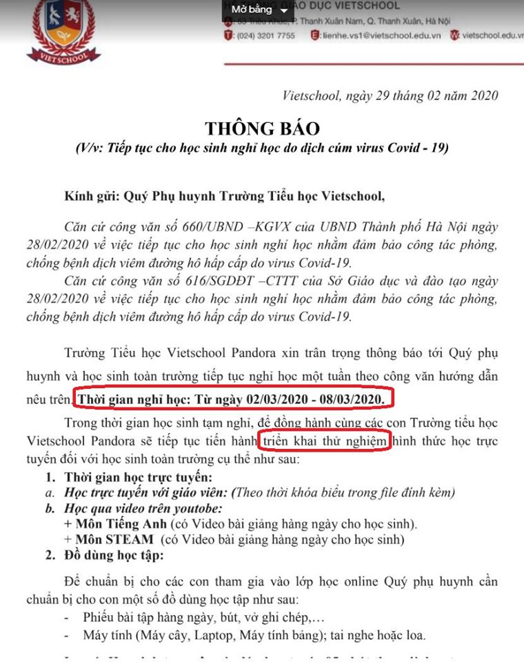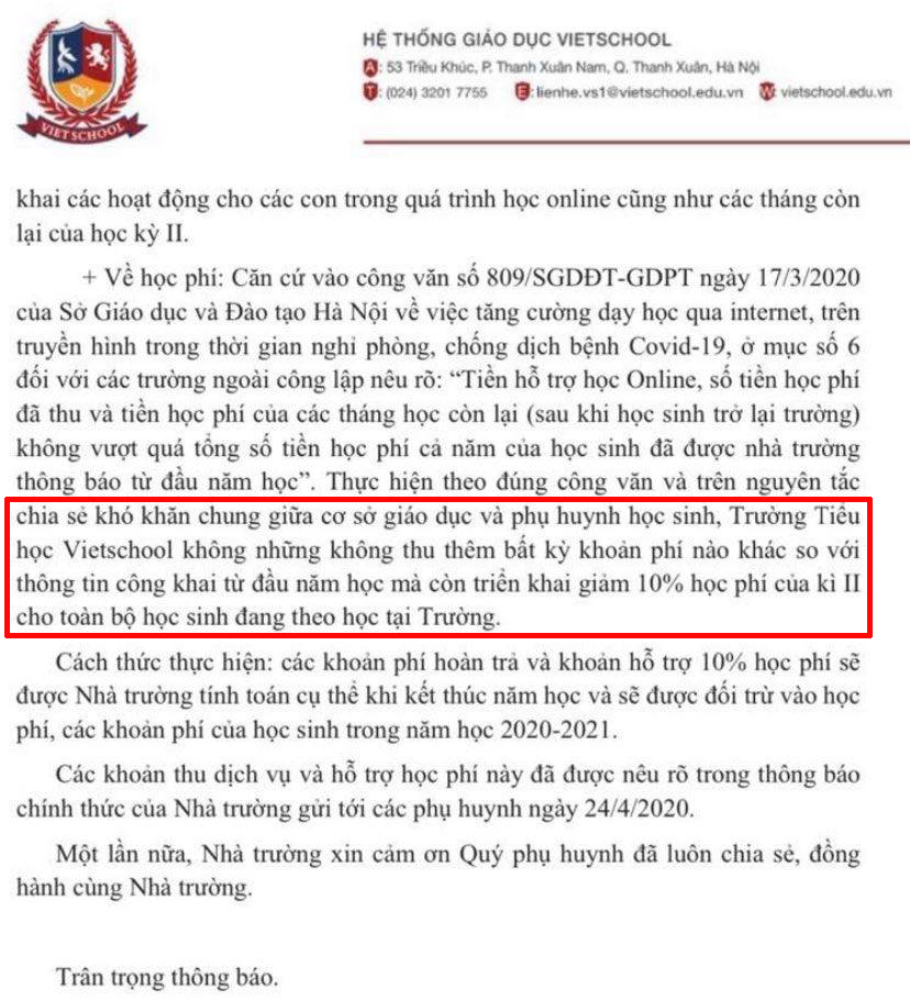 Theo Ban phụ huynh trường Tiểu học Vietschool, ngay sau khi học sinh đi học trở lại, ngày 13/5, nhà trường đã gửi email thông báo lịch học và hỗ trợ học phí kỳ 2 năm học 2019-2020.