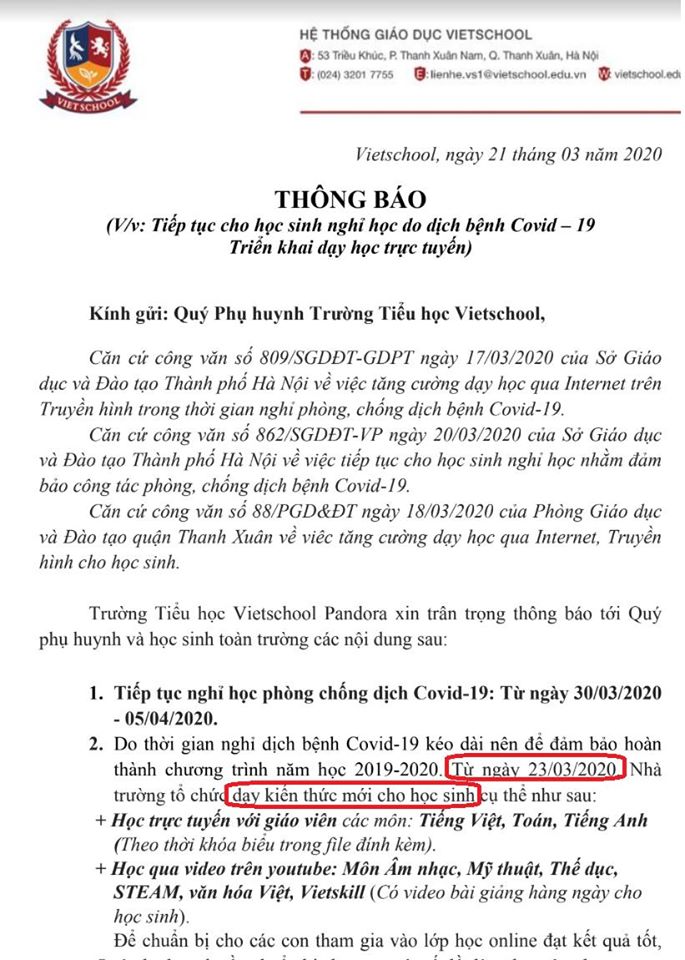 Bên cạnh đó, trường có 3 lần gửi thông báo tiếp tục nghỉ học vì dịch Covid-19 vào ngày 29/2, 7/3, 14/3. Trong các lần này, nhà trường đều ghi rõ "triển khai thử nghiệm hình thức học trực tuyến đối với học sinh toàn trường". Đến ngày 21/3, trường mới thông báo học trực tuyến với giáo viên môn tiếng Việt, Toán, tiếng Anh và học qua video trên youtube các môn âm nhạc, mỹ thuật, thể dục, STEAM, văn hóa Việt, Vietskill.