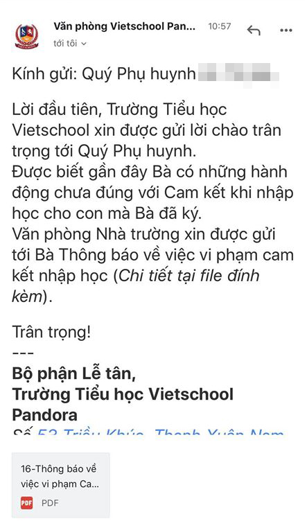 Trong email trường gửi cho phụ huynh ghi rõ: "Được biết gần đây Bà có những hành động chưa đúng với cam kết khi nhập học cho con mà Bà đã ký. Văn phòng Nhà trường xin được gửi tới Bà thông báo về việc vi phạm cam kết nhập học".