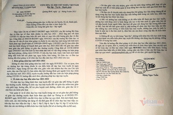 Liên quan các khoản thu đầu năm học 2021-2022, ngày 1/9/2021, Sở GD&ĐT Quảng Bình có Công văn số 2846 hướng dẫn khai giảng và tổ chức dạy học đầu năm học 2021-2022, trong đó yêu cầu “Không để xảy ra tình trạng lạm thu, không tổ chức thu tiền học sinh trong lúc dịch bệnh còn diễn biến phức tạp; tuyệt đối không vận động ủng hộ phòng, chống Covid-19 trong học sinh”.