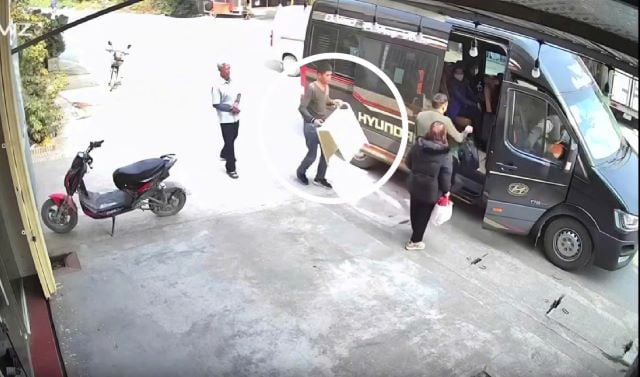 Theo hình ảnh trích xuất từ camera an ninh, chiếc bảng hiệu được đặt trên vỉa hè, sát khu vực người dân đứng chờ xe. Khi chiếc xe khách dừng lại, phụ xe theo thói quen nhanh chóng xuống hỗ trợ xách hành lý cho khách lên xe. Trong lúc vội vàng, người này đã nhầm chiếc bảng hiệu là đồ đạc của hành khách.