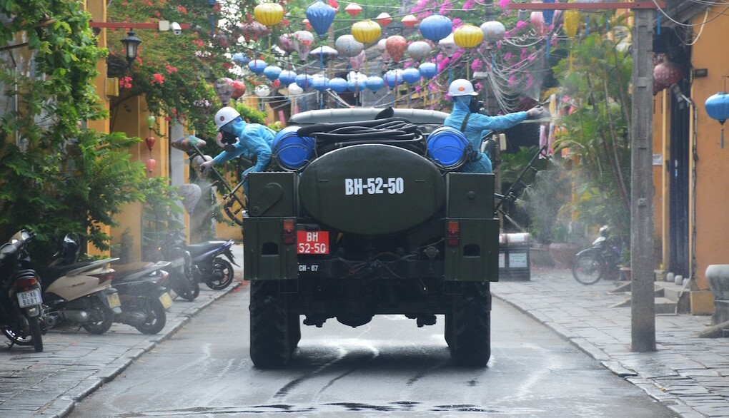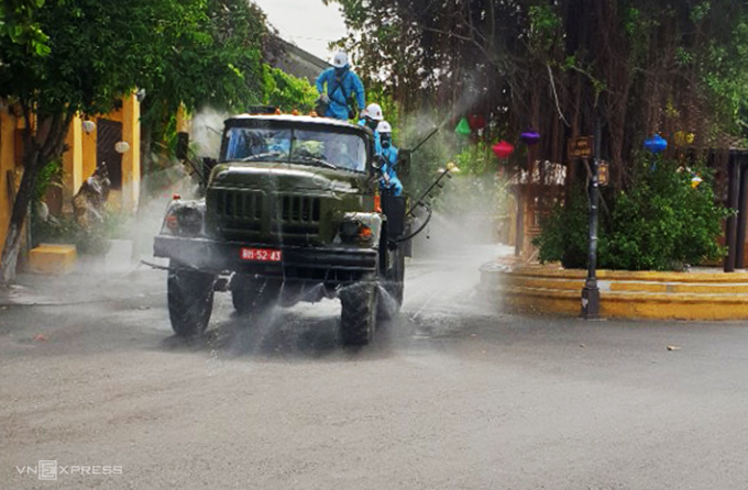 Hơn 10h, việc phun hóa chất khử khuẩn phố cổ Hội An hoàn tất. "Quân đội đã sử dụng hơn 220 kg hoá chất Chloramin B để phun khử khuẩn 40.000 m2 trên địa bàn", ông Nguyễn Văn An, Chỉ huy trưởng cơ quan quân sự thành phố Hội An cho biết.