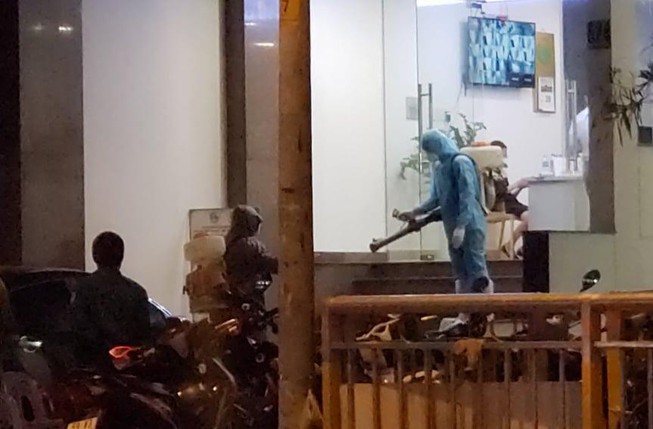 Ghi nhận vào lúc 22 giờ 10 ngày 28-7, một xe cấp cứu đậu trước khách sạn này, sau đó nhân viên y tế mặc đồ bảo hộ đi vào trong và tiến hành phun thuốc nhiều khu vực.