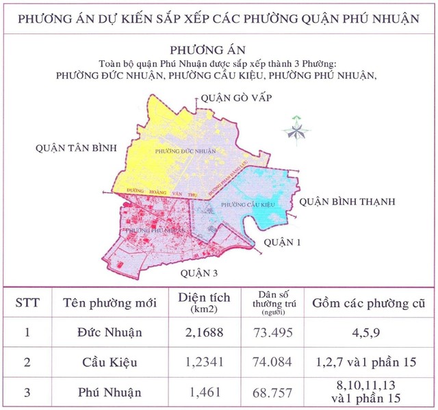 - Phường Đức Nhuận: trên cơ sở sát nhập nguyên trạng phường 4, phường 5, phường 9. Phường mới có diện tích 2,16 km2, dân số 73.495 người.