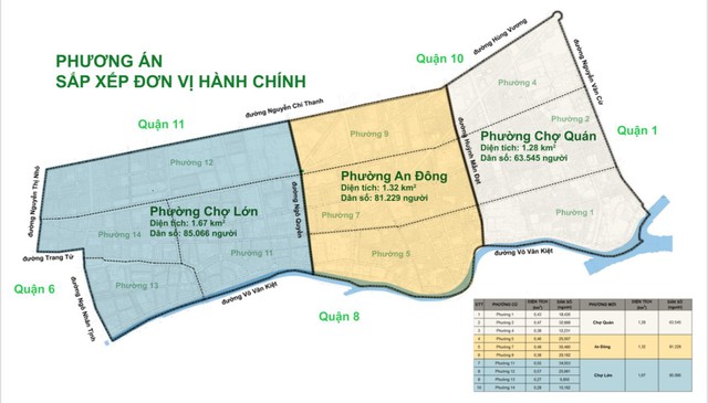 - Phường Chợ Lớn: trên cơ sở sáp nhập phường 11, phường 12, phường 13, phường 14. PHường mới có diện tích 1,67 km2, dân số 85.066 người.