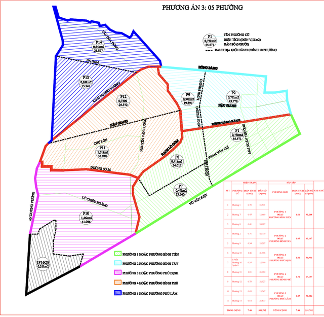 - Phường Bình Phú: trên cơ sở sáp nhập phường 11, phường 12. Phường mới có diện tích 1,11 km2, dân số 59.795 người.