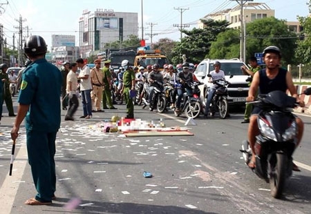 Anh Lê Minh Tâm (26 tuổi, quê Sóc Trăng) trong lúc đi bộ băng ngang Quốc lộ 13 đón mẹ và con gái lên Bình Dương chữa bệnh đã bị một xe tải cán chết tại chỗ.