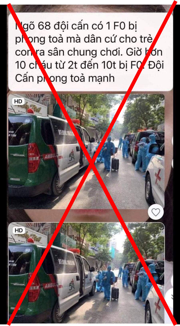 Ngày 17/8, trên mạng xã hội xuất hiện thông tin “Ngõ 68 Đội Cấn có 1 F0 bị phong toả mà dân cứ cho trẻ con ra sân chung chơi. Giờ hơn 10 cháu từ 2 đến 10 tuổi bị F0. Đội Cấn phong toả mạnh”. Cùng với nội dung này là hình ảnh xe cứu thương và nhiều người mặc đồ bảo hộ được đăng tải.