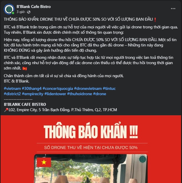 Theo đó, tối 30/4, màn trình diễn 10.500 đã diễn ra ở công viên bờ sông Sài Gòn. Tuy nhiên, do sự cố kỹ thuật, nhiều drone đã bị rơi xuống. Để hỗ trợ BTC, quán cà phê B'Blank Cafe Bistro đã gây chú ý khi đăng bài kêu gọi người dân trả lại drone tại các địa điểm tập kết được cung cấp. Quán nước này còn có hành động đẹp khi thông báo tặng 1 phần nước bất kỳ trong menu cho những người hoàn trả drone tại quán hoặc tại địa điểm thu gom chính thức.