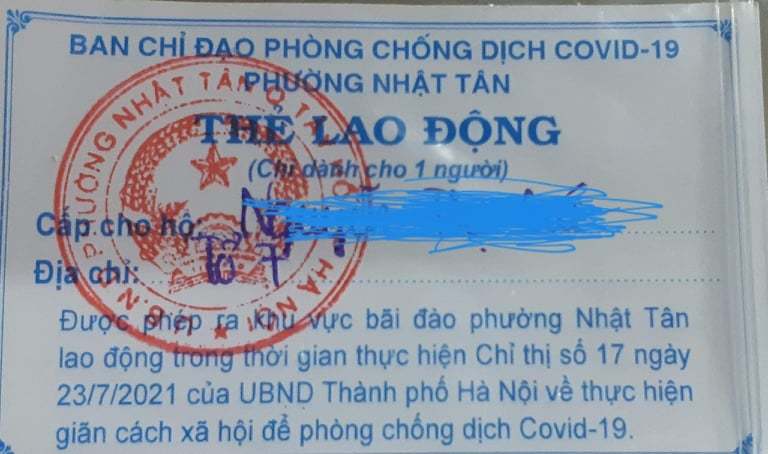 Ngoài phát phiếu đi chợ, phường Nhật Tân còn phát thẻ lao động cho các hộ gia đình, mỗi hộ một người, được phép ra vào bãi đào phường Nhật Tân lao động trong thời gian giãn cách xã hội.