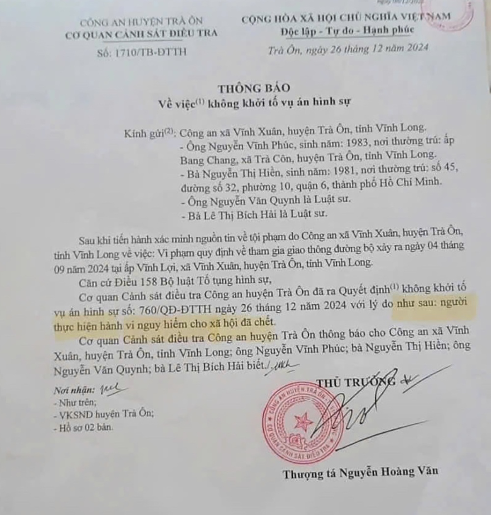 Tuy nhiên, đến giai đoạn điều tra của Cơ quan CSĐT Công an huyện Trà Ôn bắt đầu có sự khác biệt. Ngày 26/12/2024, Công an huyện ra Quyết định số 760/QĐ-ĐTTH về việc không khởi tố vụ án hình sự, với lý do "người thực hiện hành vi nguy hiểm cho xã hội đã chết".