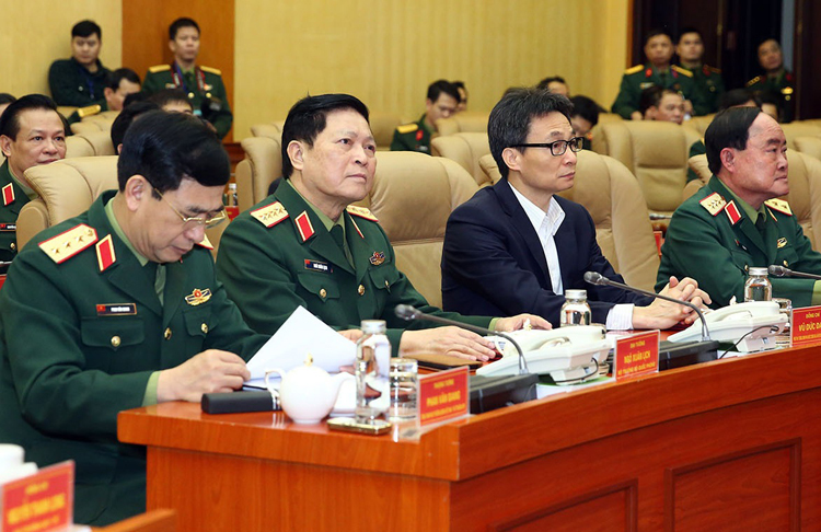 Phó thủ tướng Vũ Đức Đam, Trưởng ban chỉ đạo quốc gia phòng, chống Covid-19 cùng Đại tướng Ngô Xuân Lịch (Bộ trưởng Quốc phòng) chỉ đạo cuộc diễn tập.