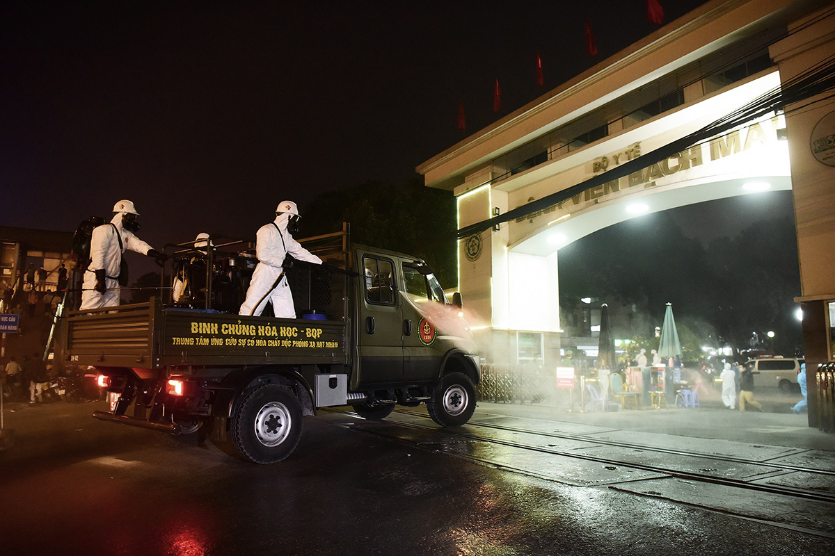 19h, 10 xe đặc chủng của binh chủng với gần 100 chiến sĩ thuộc Trung tâm ứng cứu sự cố hoá chất, phóng xạ hạt nhân đã phun khử khuẩn Bệnh viện Bạch Mai, bắt đầu từ cổng chính tại số 78 Giải Phóng, quận Đống Đa.