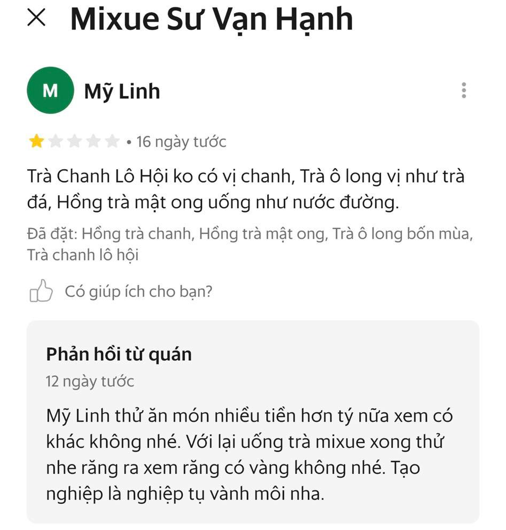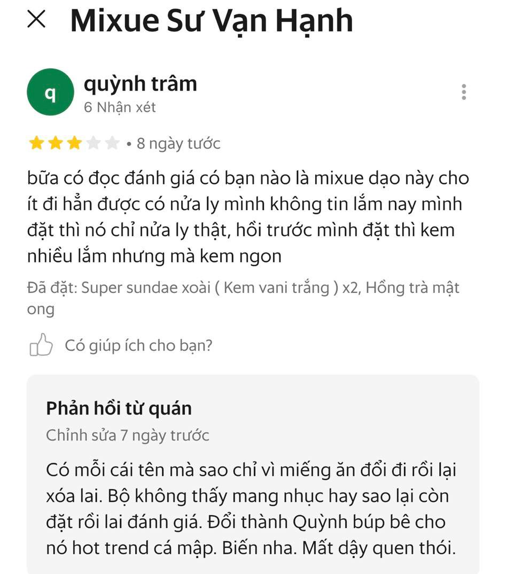 Trước "bão" dư luận, anh T. - chủ quán trà sữa Mixue, số 830 đường Sư Vạn Hạnh cho biết, người trả lời những phản hồi trên app là quản lý của quán. Những ngày qua, anh T. và quản lý đã ngồi lại để xem xét tình hình. Quản lý nghi ngờ quán bị một số người chơi xấu, dùng một số điện thoại nhưng đổi tên nhiều tài khoản, sau đó để lại bình luận tiêu cực, đánh giá sao thấp khiến quán tụt hạng.