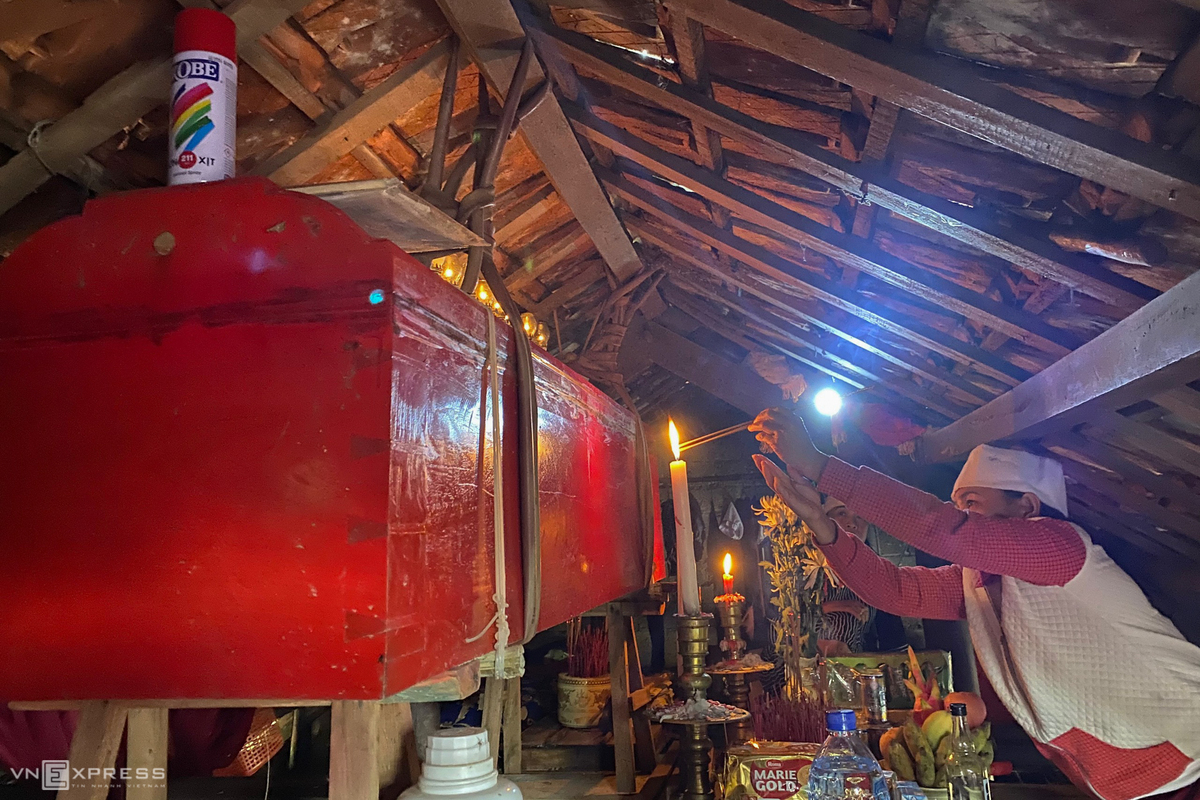 Gần một tuần nay, gia đình chị Lê Thị Trang (28 tuổi, ở đội 4, thôn Đại Phong, xã Phong Thủy, huyện Lệ Thủy, tỉnh Quảng Bình) phải treo quan tài người mẹ lên trần nhà vì nước lũ dâng cao. Mẹ chồng chị Trang năm nay 75 tuổi, qua đời hôm 17/10.