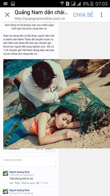 Theo tìm hiểu, trang quangnamonline.com.vn nêu thông tin: “Sáng hôm nay, sau nhiều ngày mai phục, người dân chài lưới tại xóm Lưới - xã Tam Anh Nam - huyện Núi Thành - Quảng Nam đã bắt được nàng tiên cá nặng 48kg… Theo anh Trần Nhật Dũng - người trực tiếp bắt được nàng tiên cá: Sau khi bắt được nàng tiên cá, người dân đã chở ra Bệnh viện Minh Thiện để truyền nước và bảo đảm sức khỏe để chờ các chuyên gia khoa học người Mỹ sang nghiên cứu. Đã có một số chuyên gia Việt Nam đang tiếp cận bảo vệ sức khỏe cho nàng tiên cá. Được biết có một đại gia người Nhật đã trả 1 triệu USD để mua nàng tiên cá này, nhưng anh Dũng đã từ chối”.