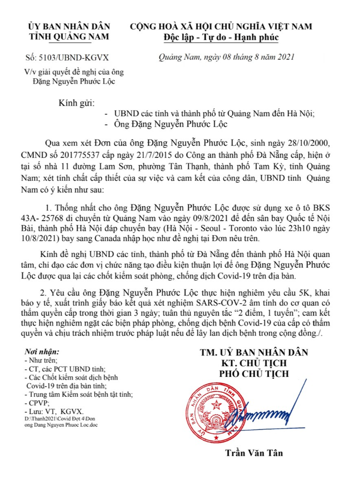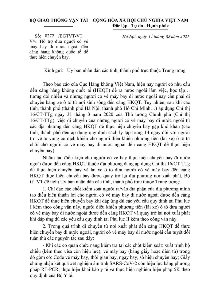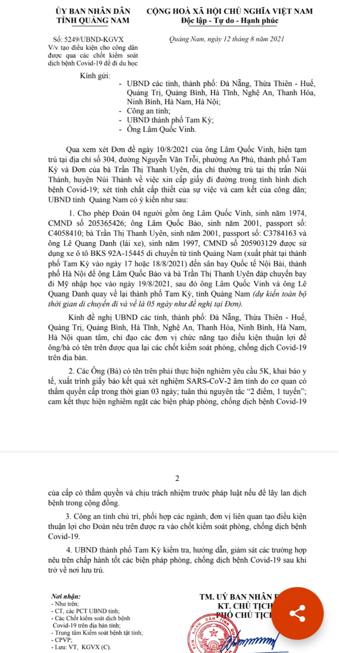 Theo tỉnh Quảng Nam, thực hiện chỉ đạo của Bộ GTVT tại CV số 8272/BGTVT-VT ngày 11-8-2021, về việc hỗ trợ đưa người có vé máy bay đi nước ngoài đến cảng hàng không quốc tế để thực hiện chuyến bay, theo nguyện vọng của những gia đình có con đi du học, UBND tỉnh Quảng Nam đã có văn bản gửi cho các địa phương đang có dịch thực hiện quản lý chặt chẽ xe ra vào địa phương tạo điều kiện cho một số trường hợp có con đi du học nước ngoài từ Quảng Nam ra sân bay Nội Bài.