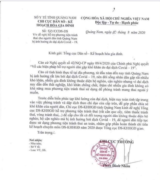 "Căn cứ vào tình hình thực tế tại địa phương, từ đầu năm đến nay tỉnh Quảng Nam bị ảnh hưởng rất lớn bởi đại dịch Covid-19, nên đời sống nhân dân gặp rất nhiều khó khăn, nhiều gia đình không thuộc hộ nghèo, hộ cận nghèo nhưng vì đại dịch nay dẫn đến thất nghiệp, khó khăn chồng chất, thậm chí nhiều gia đình không có khả năng mua phương tiện tránh thai ngoài ý muốn", văn bản nêu.