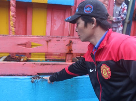 Thuyền trưởng kiêm chủ tàu Biên chỉ một vết tích trên tàu cá do bị tàu tuần tiễn Đài Loan đâm va |