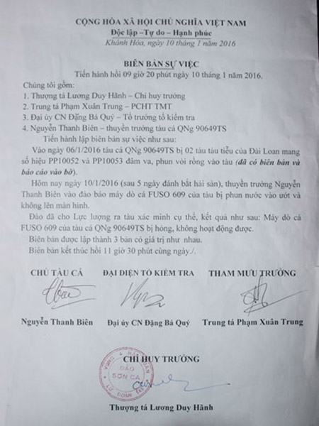 Sau khi xảy ra vụ việc, thuyền trưởng Biên đã vào trình báo và được cơ quan chức năng đảo Sơn Ca lập biên bản. Theo văn bản do Thượng tá Lương Duy Hãnh, Chỉ huy trưởng đảo Sơn Ca lập và cung cấp thì vào 8g50 ngày 6.1.2016, ngoài tàu ngư dân biên, còn có tàu cá mang số hiệu QNg 90929 Ts cũng đã bị tàu Đài Loan dùng phương tiện va tông và sử dụng vòi rồng tấn công.