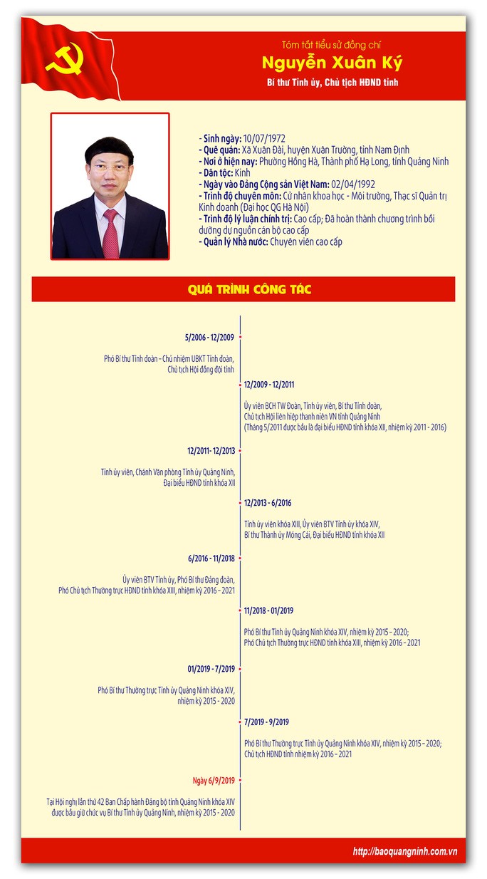 Trước khi được bầu làm Bí thư Tỉnh ủy Quảng Ninh, nhiệm kỳ 2015-2020, ông Nguyễn Xuân Ký, SN 1972, từng giữ các chức vụ Bí thư Thành ủy TP Móng Cái; Ủy viên Ban Thường vụ, Phó Chủ tịch Thường trực HĐND tỉnh; Phó Bí thư Thường trực Tỉnh ủy, Chủ tịch HĐND tỉnh Quảng Ninh.