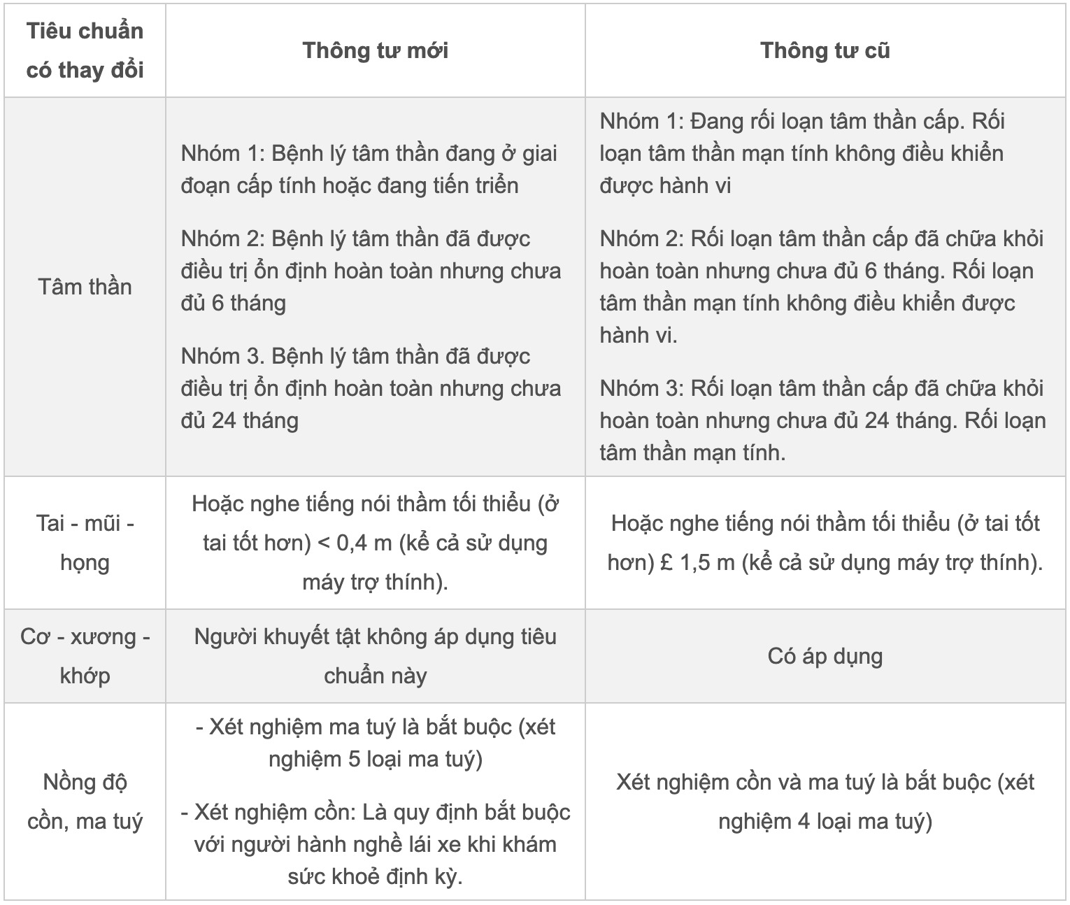 Về xét nghiệm ma tuý và nồng độ cồn, theo Thông tư mới, khám sức khoẻ cấp đổi giấy phép lái xe bắt buộc xét nghiệm nồng độ ma tuý (5 loại ma tuý, so với quy định cũ là 4 loại); với nồng độ cồn không bắt buộc 100% phải xét nghiệm; chỉ thực hiện nếu có chỉ định của bác sĩ (khi nghi ngờ).