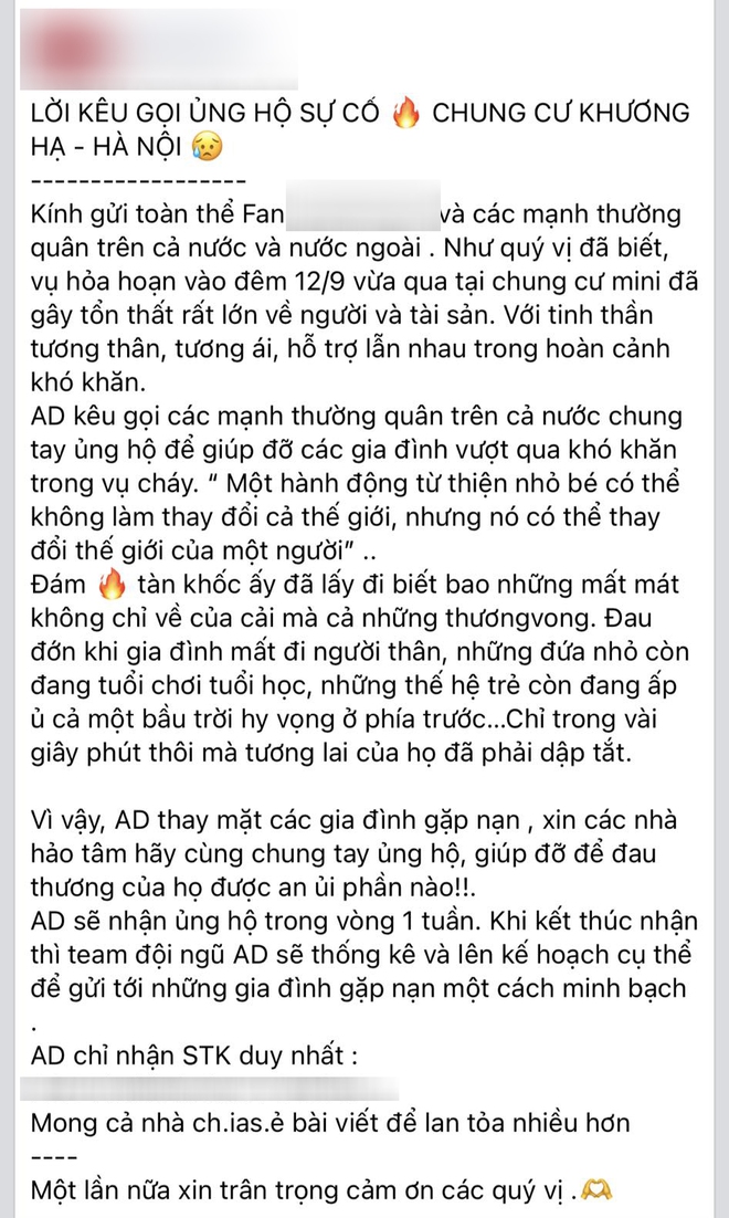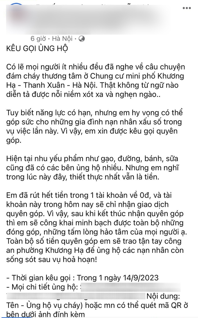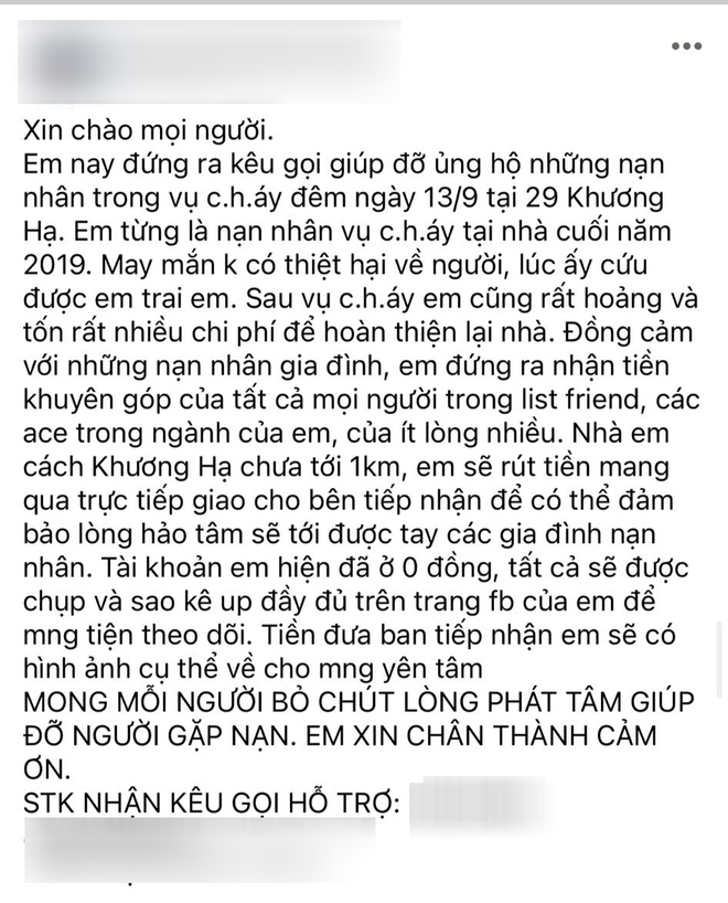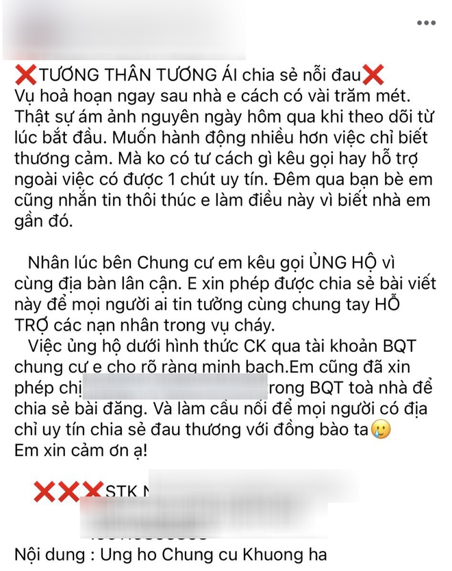 Cùng với đó, trong những ngày qua, có không ít bài đăng kêu gọi ủng hộ nạn nhân trong vụ cháy xuất hiện tràn lan trên các trang MXH và nhanh chóng nhận được sự chú ý của nhiều người.