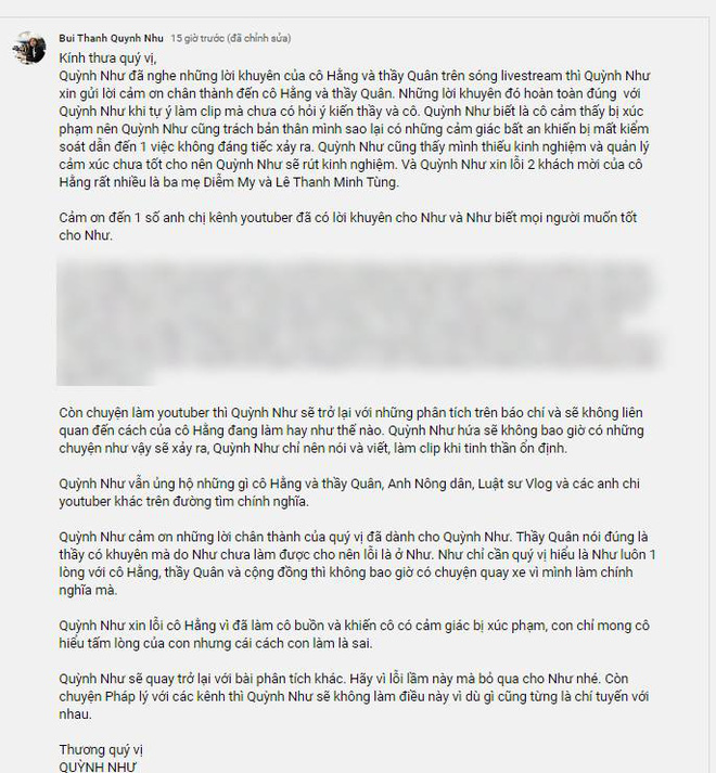 Sau một loạt những động thái tranh cãi với bà Nguyễn Phương Hằng trên mạng xã hội, mới đây, Bùi Thanh Quỳnh Như, cô gái thường được biết đến với tên gọi "Quỳnh Như Vlog" đã đăng tải một bức tâm thư khá dài trên kênh YouTube của mình.