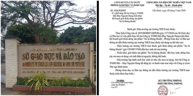 Sau đó, phòng GD&ĐT huyện Cần Đước tiếp tục ra văn bản đến hiệu trưởng các trường THCS trên địa bàn huyện này để giới thiệu sản phẩm "áo lá kháng khuẩn" dành cho nữ sinh với giá 129.000 đồng/cái.