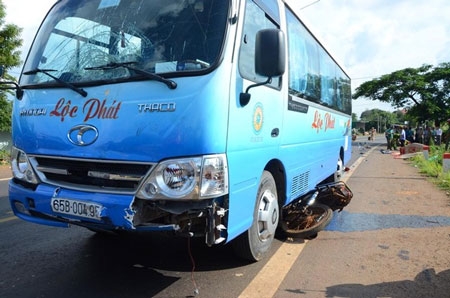 Chiều 23/7, chạy đến xã Đắk Gằn, huyện Đắk Mil (Đắk Nông), chiếc xe khách đã tông trúng xe máy.