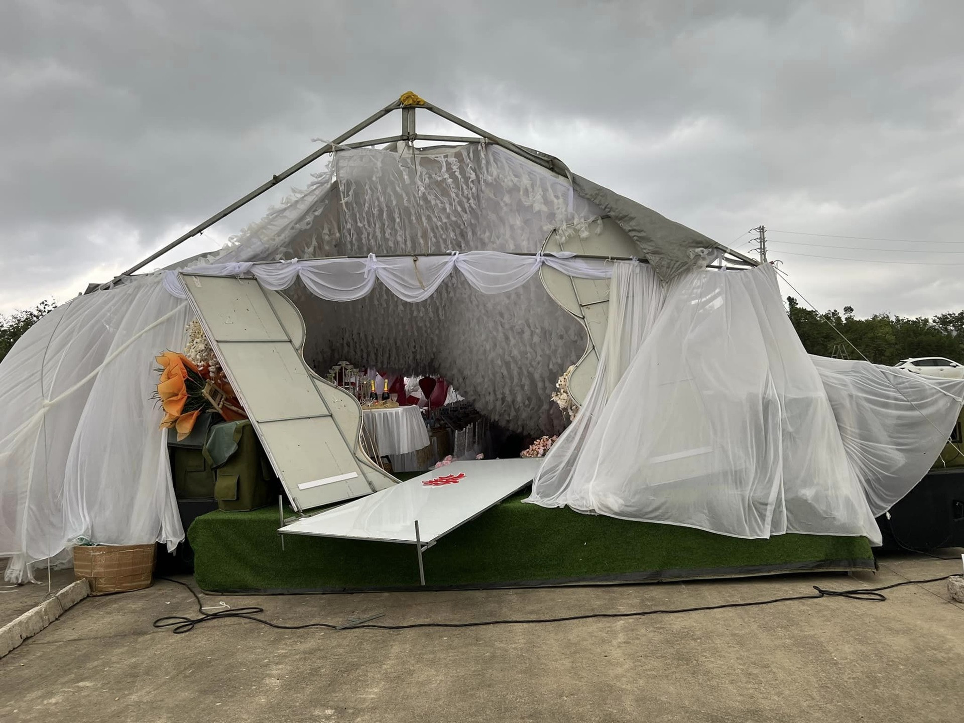 Bất chấp cơn mưa xối xả, một số người trèo lên mái để gia cố cho hệ thống khung rạp cưới, một số người cố gắng giữ các trụ cột đề phòng gió cuốn đi. Tuy nhiên, cơn lốc bất ngờ ập tới đã cuốn phăng lớp mái và phông màn trang trí. Toàn bộ rạp chuẩn bị cho đám cưới dựng ở khoảng đất trống trước nhà bị hư hỏng, đổ sập chỉ vài giây khi cơn lốc quét qua.